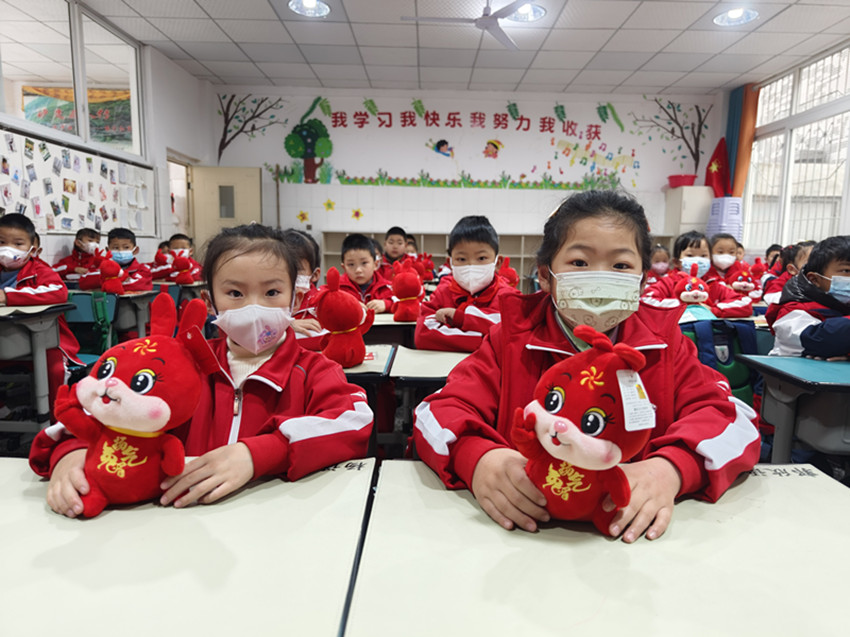 記者注意到,整個(gè)校園及各班教室都布置了精美的迎新文化墻,上面張貼懸掛著學(xué)生們?cè)诤偕钪兄谱鞯闹黝}創(chuàng)意海報(bào)。教室內(nèi),每張課桌上不僅插著寫滿祝福語的彩色氣球,還擺放著用紅絲帶打包好的新課本或一套精美文具或一只兔子玩偶,亦或是棒棒糖、旺仔牛奶等零食,均寓意新學(xué)期大吉大利、越來越棒、大展鴻“兔”、“兔”飛猛進(jìn)?!斑@些別出心裁的小禮物,能給孩子們留下一個(gè)美好的記憶點(diǎn),在給學(xué)生們帶來驚喜的同時(shí),也送上一份最美、最真摯的新學(xué)期祝福!”教師黃宇虹說。