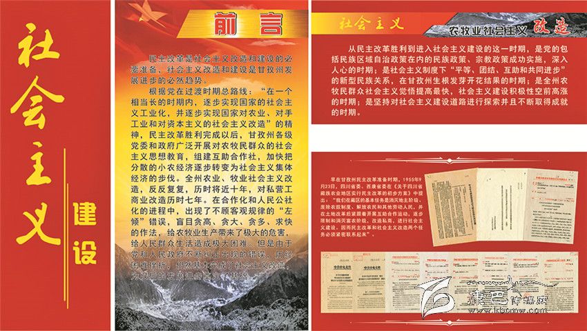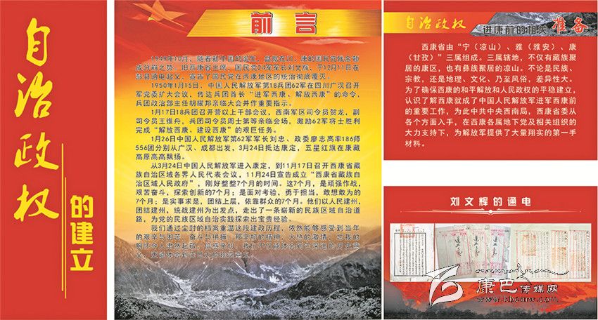 《甘孜州檔案館愛國主義教育基地》的整個展覽分為四大板塊。第一部分命名為“自治政權(quán)的建立”,向參觀者介紹了甘孜藏族自治州誕生的歷史過程;第二部分是“民主改革運動”,把人們帶回了那段不能忘記的烽火歲月;第三部分是“社會主義建設(shè)”,深情地回顧了在建設(shè)社會主義事業(yè)中我州所取得的不平凡的成就;第四部分是“改革開放”,讓人們重溫了在改革開放的大潮中所經(jīng)歷的那些充滿激情的經(jīng)歷。