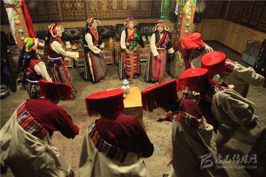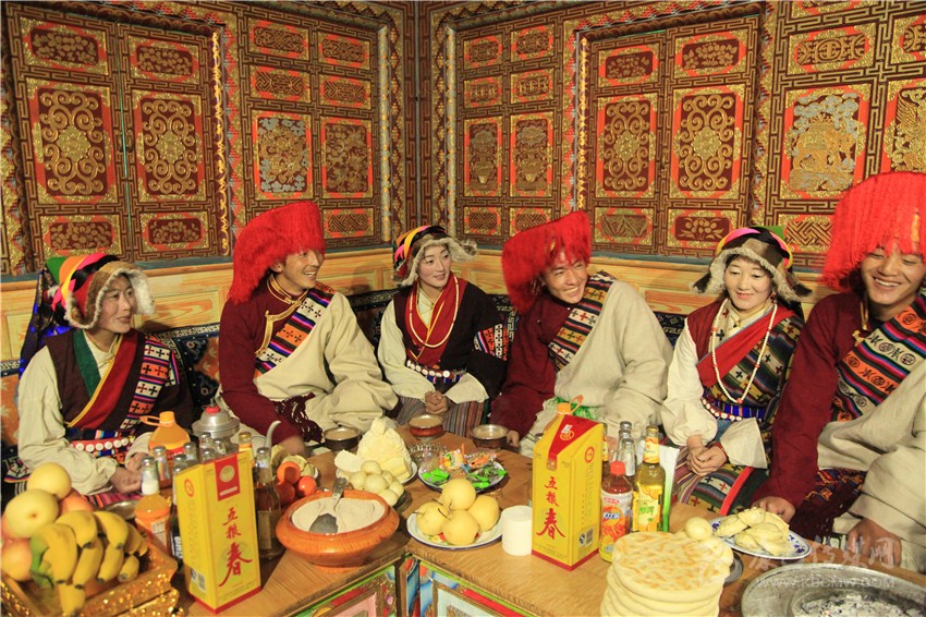 一家人穿上節(jié)日盛裝,按輩序就座。主婦手捧吉祥斗恭恭敬敬地走到長輩跟前說“扎西德勒”,對方抓幾粒麥子邊向上撒邊祝福說:“扎西德勒!美滿幸福,祝主婦身體健康,預祝明年大家仍如此團聚歡慶?!痹僮ヒ稽c切瑪送進嘴里。家庭儀式后,家中兩人一個拿青稞酒、銀酒碗,一個手捧切瑪,到左鄰右舍、親朋好友家拜年,敬獻切瑪、青稞酒,互相祝福。