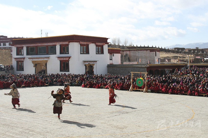 2月25日,是藏歷的12月29日,理塘縣長青春科爾寺舉行了盛大的“古多”儀軌活動(dòng)。僧人在寺廟廣場表演“羌姆”,各區(qū)鄉(xiāng)鎮(zhèn)農(nóng)牧民群眾近萬人匯聚于此,觀看表演?!扒寄贰币鉃樘?,是藏傳佛教中融宗教性、藝術(shù)性為一體的法舞儀式,本地藏族群眾又稱其為“巴羌”,即“面具法舞”,寄寓了人們辭舊迎新、禳災(zāi)祈福的美好愿望。