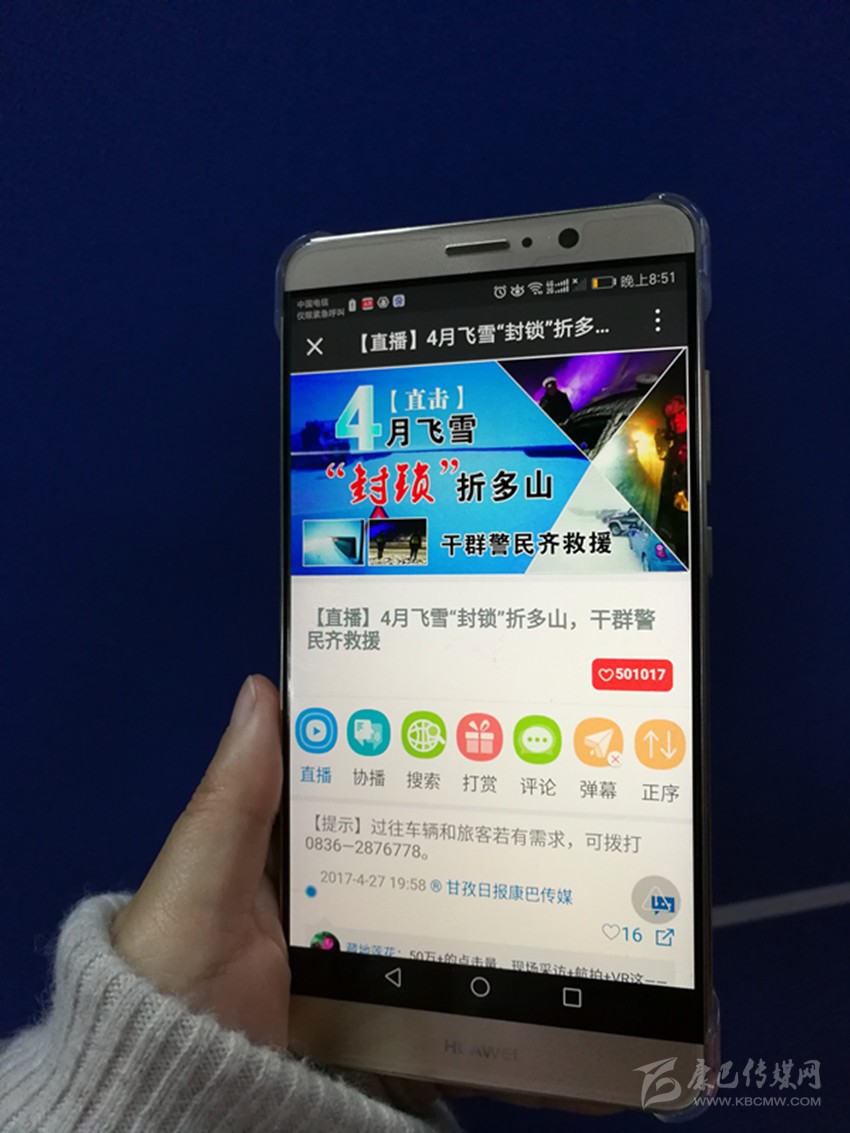 一路上,記者通過甘孜日報微信平臺,將救援情況和群眾的實(shí)況,第一時間進(jìn)行了直播。隨著一條條現(xiàn)場圖片、文字和視頻的及時發(fā)布,人們第一時間得知了折多山受困車輛和群眾得到救助的實(shí)際情況,人們紛紛在直播平臺留言,為交通、路政和當(dāng)?shù)攸h委、政府的救援行動點(diǎn)贊。在對折多山強(qiáng)降雪和受堵現(xiàn)場進(jìn)行直播報道的同時,甘孜日報社還利用直播平臺,回顧了折多山道路交通難的歷史,并再次發(fā)布雅康高速修建、折多山隧道立項等重大交通建設(shè)工程的進(jìn)展情況,又對此次折多山風(fēng)雪阻斷道路交通,導(dǎo)致車輛和人群滯留的特殊原因進(jìn)行了報道和澄清,并報道了風(fēng)雪中仍有不少徒步游客繼續(xù)甘孜之旅的情況,第一時間讓更多的人了解到,飛雪并未對道路造成致命影響,甘孜州的道路交通狀況和應(yīng)急處置能力已經(jīng)得到了極大的提升,完全有能力保障人們出行以及生命、財產(chǎn)安全。
