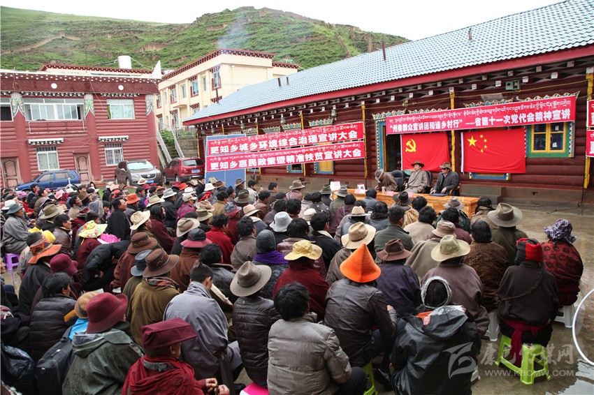 上午10時30分,宣講在濛濛細(xì)雨中開始了。只見村民們?nèi)纪χ毖鼦U端坐在雨中,一雙雙渴望的眼睛聚焦在宣講臺上;宣講員松吉尼瑪用生動的例子、經(jīng)典的藏族諺語講述了黨的政策和省第十一次黨代會精神,生動感人的宣講讓現(xiàn)場400余名村民、寺廟僧尼和各級干部滿意的笑聲瞬間蓋過了打著持久戰(zhàn)的雨聲。