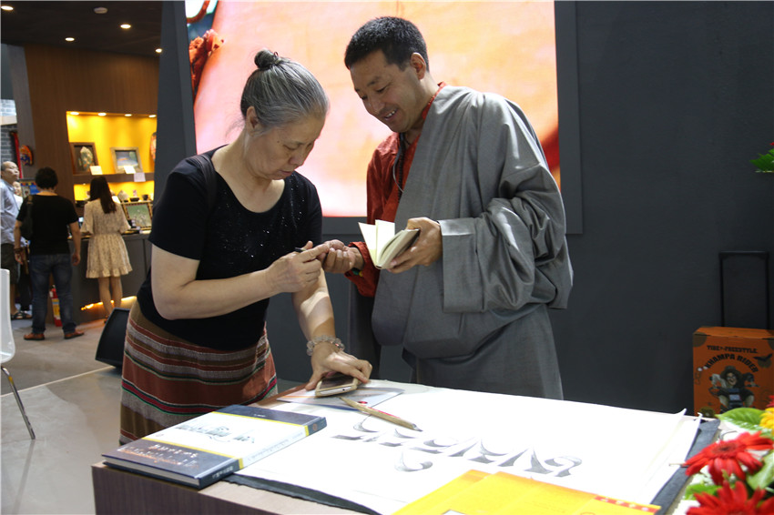 而在同一地點的另一側(cè),省級藏文書法傳承人巴松鄧珠的藏文書法也吸引著眾多愛好書法市民前來觀賞,還有的與他合影?!爸笇н^我的書法家非常多,他們不僅給了我許多寶貴的意見,更重要的是給了我信心和動力,讓我堅持寫書法,并成為康體藏文書法的傳承人。”巴松鄧珠說,這次能夠得到州委、州政府搭建的平臺,我會珍惜好這次難得的機遇,把作品展示好、宣傳好,讓全國各地的人們更多地了解我州民族文化。
