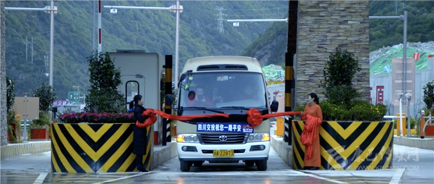 “木雅古碉”建筑矗立兩旁、六出四進通道一字排開;巨大熒幕流光溢彩,連接通道窗明幾凈;從無人機航拍畫面可以看到,一面巨大的五星紅旗,已在站頂平層鋪展開來……9月28日上午8時整,一輛客車從升航特大橋駛來,撞破紅綢駛向康定城,旁邊車道上等待多時的車輛依次行進,雅康高速公路上規(guī)模最大的收費站——康定收費站正式啟用,康定連接線和入城大道通車?!翱刀ㄟB接線建成后將極大提高雅康高速公路進入康定城區(qū)車輛通行效率、有效改善康定入城交通的擁堵狀況。”藏區(qū)高速公路公司相關(guān)負責(zé)人如是說。