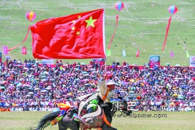7月25日,第八屆康巴文化藝術(shù)節(jié)在玉樹藏族自治州開幕。數(shù)名參加開幕式的藏族老鄉(xiāng)高舉鮮艷的五星紅旗策馬狂奔,風(fēng)馳電掣,跨越扎西科賽馬場(chǎng),一瞬間,歡呼聲震耳欲聾,開幕式進(jìn)入高潮。