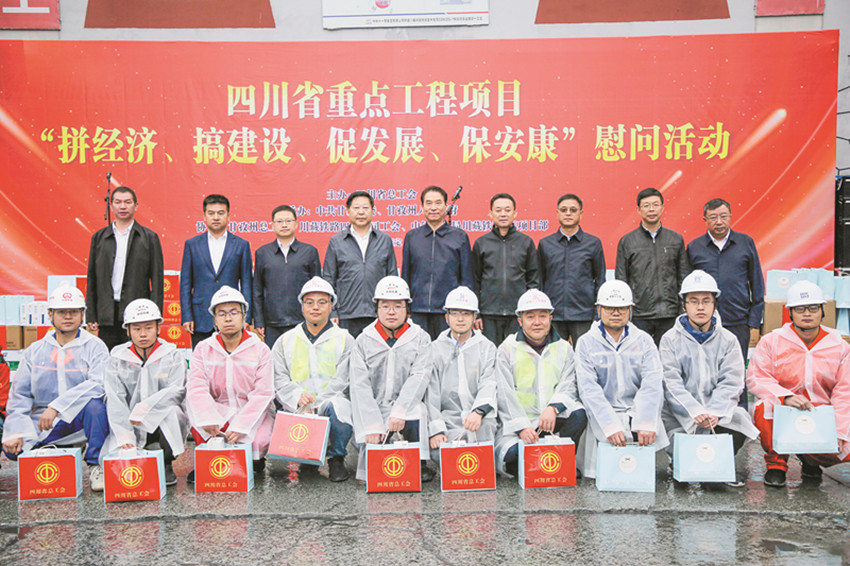 省委常委、統(tǒng)戰(zhàn)部長(zhǎng)趙俊民(左五),州委書(shū)記沈陽(yáng)(右四)等領(lǐng)導(dǎo)赴甘孜州重點(diǎn)工程項(xiàng)目開(kāi)展“拼經(jīng)濟(jì)、促發(fā)展、保安康”慰問(wèn)活動(dòng)。