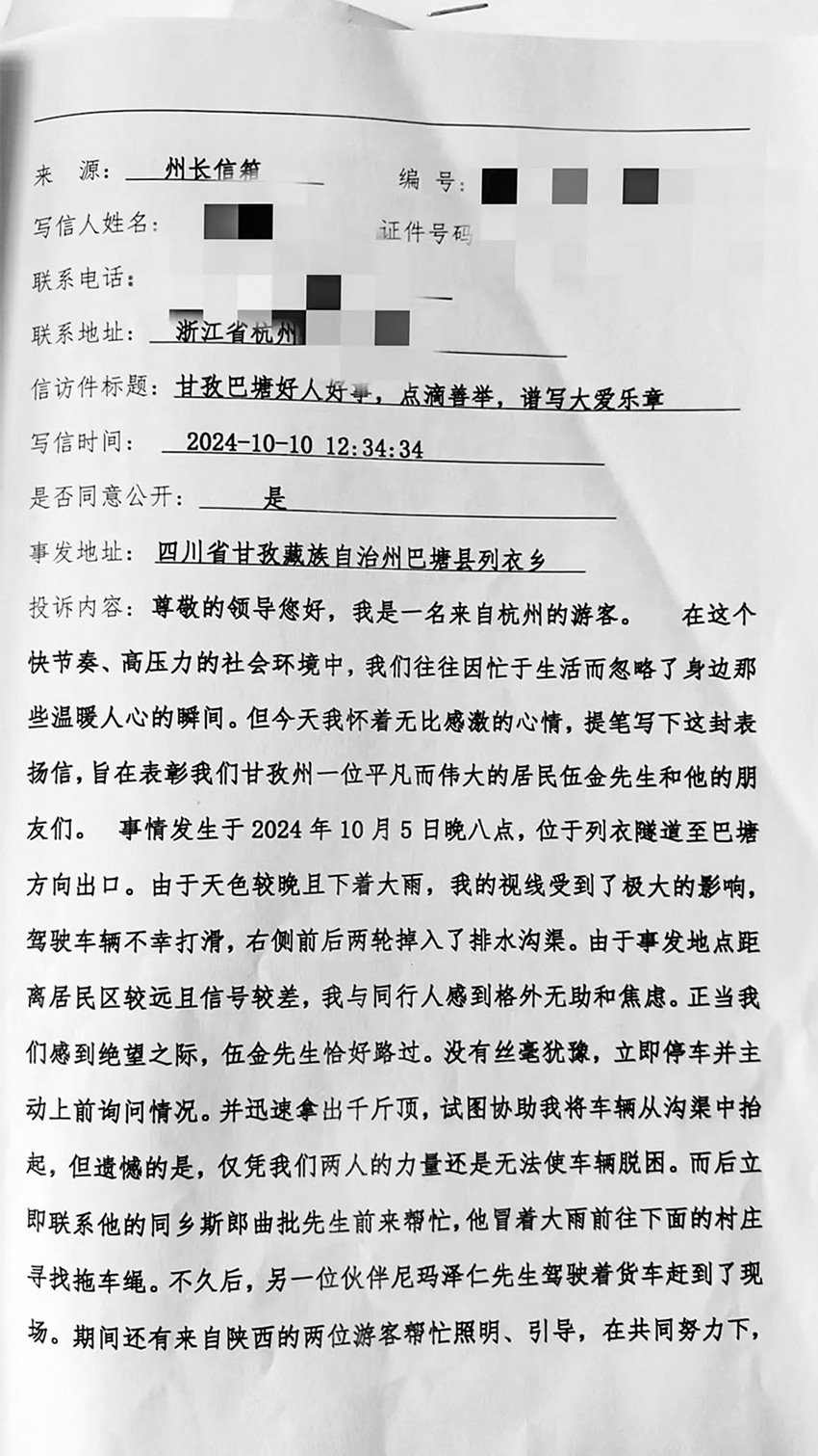 一封感謝信,從杭州的網(wǎng)端出發(fā),抵達“州長信箱”,再轉(zhuǎn)送到巴塘,跨越千里,情意綿長,引出一段感人至深的好人好事。“尊敬的領(lǐng)導您好,我是一名來自杭州的游客。今天我懷著無比感激的心情,提筆寫下這封表揚信,旨在表彰我們甘孜州一位平凡而偉大的居民伍金先生和他的朋友們……”