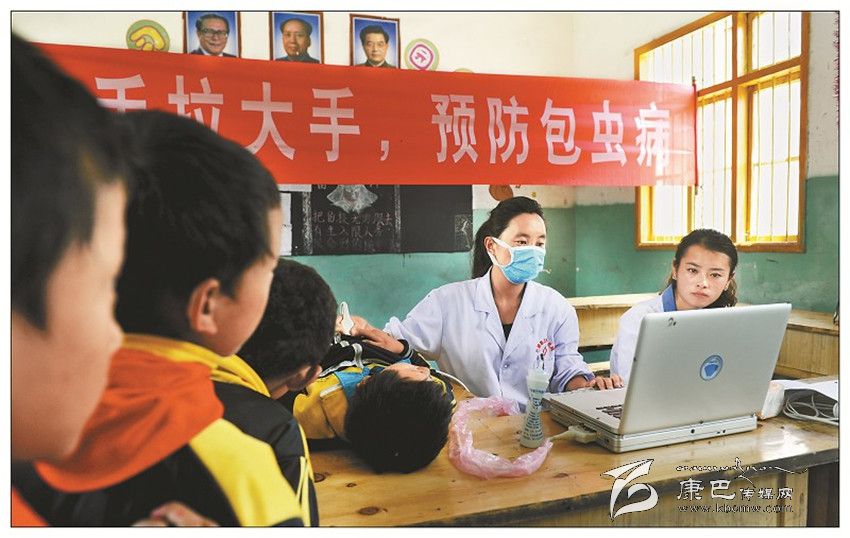 高原防控——醫(yī)務(wù)人員在預(yù)防包蟲(chóng)病現(xiàn)場(chǎng)為學(xué)生檢查身體。