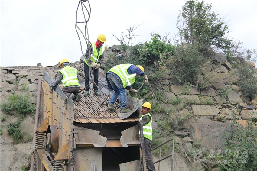 8月25日,塔公村采砂場早已停止了一切生產(chǎn)。記者在現(xiàn)場看到,起重機(jī)正將砂場里10多米長,非常笨重的傳送帶拆放在地上。數(shù)十名村民和工人一起,用挖機(jī)、吊車、氣割機(jī)等設(shè)備將生產(chǎn)砂石的設(shè)備進(jìn)行拆解,拆除的生產(chǎn)設(shè)備、機(jī)械零件整齊地?cái)R置一旁,砂場拆除工作正在安全有序進(jìn)行。望著曾經(jīng)給村民帶來巨大效益的設(shè)備被拆解在地上,塔公村村主任伍金多吉流下了傷心的淚水。