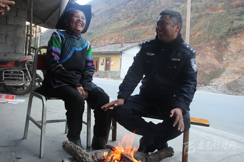 談話間,我們已行至山嶺42道彎,堵堵石壁似摩天大廈仰面壓來,咄咄逼人,像是即將坍塌下來。暮色漸晚,回到蘿卜絲檢查站吃飯,簡單的三菜一湯,四人圍坐,吃至一半,拉鐵哥才推門進來,不好意思地跟我抱歉:“實在不好意思,我媳婦孩子剛到一會,看他們吃完飯送回縣上了才過來的,吃的簡單,你不要介意?!闭f話間,簡單扒了幾口,又出門到站檢查了。后了解,拉鐵哥兩個孩子在九龍縣城上學、生活,身為九龍縣沙坪中學附小教師的妻子同時照顧著兩個孩子,教學課程實在繁重時,才能麻煩父母上縣幫忙帶帶。拉鐵哥母親尼胡烏果說:“我們都不愿意他這樣長時間值守站點,沒有回家的空閑,有時候晚上抽空回家一趟,我們都睡了,平時好不容易回來一次,孩子都快不認識他,不跟他親近。但是我們也很理解支持,他穿上警服,就是我們一家人的選擇,我們彝族家重視家族親情,他投入這片彝族鄉(xiāng)工作,讓一萬多彝族鄉(xiāng)民都把他看作自家人,這當然也讓我驕傲!”