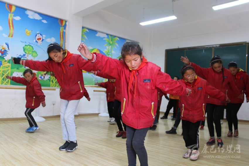 “要跟隨節(jié)拍,注意動(dòng)作協(xié)調(diào)連貫,舞蹈是非常愉悅的享受,要面帶微笑,動(dòng)作不要太僵硬?!痹谖璧甘?,老師正耐心地糾正孩子們的舞蹈動(dòng)作。老師是縣文化館的專業(yè)演員,成為學(xué)校的舞蹈老師后,她就負(fù)責(zé)全校的舞蹈教學(xué)工作。