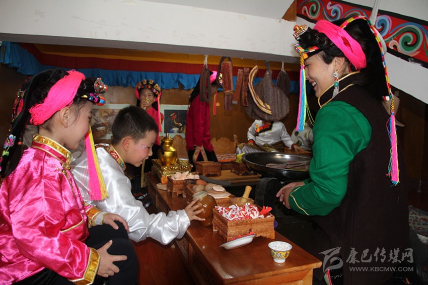 筆者正在參觀時,老師帶領(lǐng)著一群可愛的孩童走進(jìn)鍋莊房內(nèi)。孩子們脫下鞋襪,盤膝坐在藏床上,一邊做著喝酥油茶的樣子,一邊唱起古老的嘉絨歌謠。稚嫩的嗓音中,遠(yuǎn)古文化煥發(fā)出新時期的獨特魅力。老師則坐在火籠邊,不斷地“忙碌”著。孩子們“吃飽喝足”后,走到房屋主人的扮演者老師面前鞠躬致謝,文明禮儀也得到了升華。
