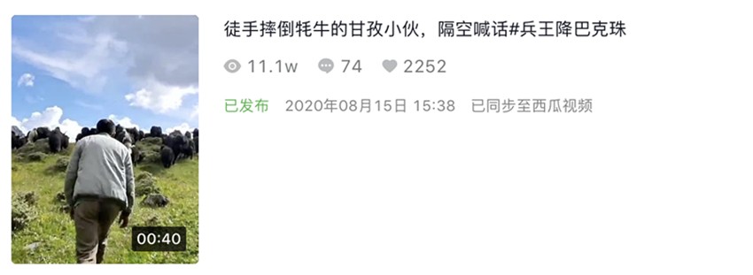8月15日,一段時長30秒的視頻出現(xiàn)在抖音平臺中,郎卡扎西用并不標(biāo)準的普通話向網(wǎng)友們介紹了自己,他趕著牦牛上山、摔倒牦牛、和朋友們打籃球的畫面依次展現(xiàn),視頻最后他面對鏡頭再次說出了自己的心聲:“要成為像降巴克珠哥哥那樣的軍人!”