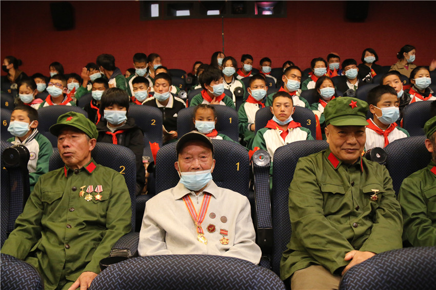 圖為95歲的抗美援朝老兵陳忠(前排中)和退役軍人代表、州特殊教育學(xué)校學(xué)生一起觀看電影《長(zhǎng)津湖》。