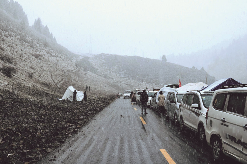 然而,高原的天、娃娃的臉,說變就變。剛剛還艷陽高照的晴好天氣,瞬間寒風(fēng)四起,鵝毛大雪不一會便覆蓋了整個山野。由于到達蟲草采集點還需4、50分鐘人力轉(zhuǎn)運物資,受天氣影響,前行受阻,擔(dān)任護送任務(wù)的民輔警當(dāng)即幫助群眾搭建臨時安置點,風(fēng)雪中警民互助的身影像極了一家人。一切收拾停當(dāng),盡管風(fēng)寒雪大,條件艱辛,樂觀的群眾和伴隨服務(wù)的民輔警還不忘在風(fēng)雪中來一張合照,他們說,這是歷年來的慣例,每次上山采集蟲草和下山返程,他們都會一個不少地拍張“全家?!保源肆裟钕x草季警民相依的美好記憶。