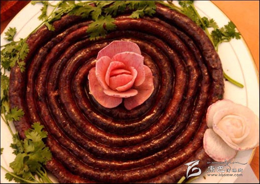 (4)血腸的烹煮,將灌好的血腸,放開湯中煮沸,煮至血腸浮起,腸成灰白色,約八成熟時便起鍋,裝入盤內(nèi),全家席地圍坐,割而食之。