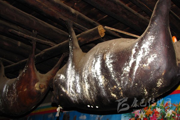豬膘:在丹巴,豬膘是一種貯存豬肉的方式,是一種飲食習(xí)俗,同時(shí),它又是財(cái)富的象征。在丹巴隨便走進(jìn)一戶人家都可以看到少則幾扇、多則十余扇的豬膘掛在樓上,有些人家的豬膘甚至還貯存十多年之久。這些豬膘大多已經(jīng)被蟲吃掉了許多,但是他們也不會心痛,因?yàn)樵谶^去,看一個(gè)丹巴人家庭是否富裕,就看他家有多少豬膘,豬膘越多就越富有。