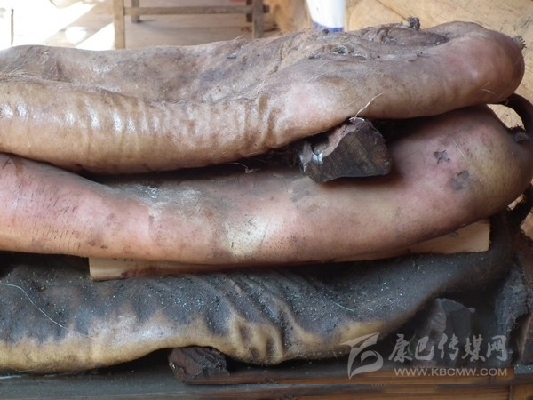 半干豬肉:在丹巴縣革什扎鄉(xiāng)有一種比較奇特的豬肉保存方法:將豬殺死后,不去毛,只在豬的腹部開一條口子取出內(nèi)臟,將血水清理干凈后用麻繩將腹部縫合。隨后用當(dāng)?shù)氐狞S泥漿敷在豬身上,在豬的身上形成一個(gè)厚約2厘米的殼,密不透風(fēng)。處理好后將其懸掛于灶塘之上,使黃泥在高溫的烘烤下快速硬化。如若發(fā)現(xiàn)黃泥層出現(xiàn)裂縫,立即用黃泥漿將其修復(fù)。等到第二年熱天時(shí),敲掉黃泥形成的硬殼,豬毛被輕松退去,豬肉依然比較新鮮。但這種保存新鮮豬肉的方法現(xiàn)在已經(jīng)很少見了,一是因?yàn)檫@種保存方法風(fēng)險(xiǎn)太大,稍有不慎豬肉就可能腐敗;二是如今物資供應(yīng)豐富,新鮮豬肉購買方便,使得此種儲存方式失去了存在的價(jià)值。