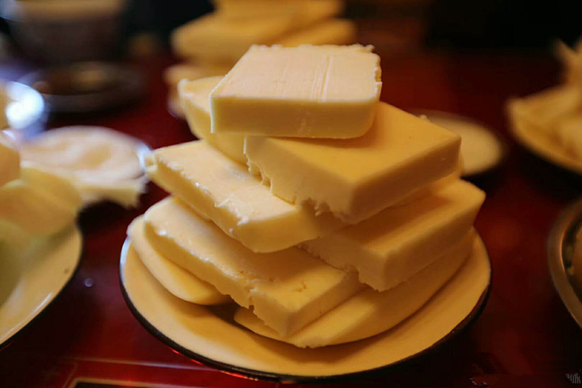 酥油是藏族民眾主要的食用油脂。藏族諺語說:“沒有駿馬的草原不美,沒有酥油的糌粑不香?!辈刈迕癖姶蛩钟筒?、揉糌粑都離不開酥油。據(jù)史料記載,文成公主入藏時(shí),帶去了內(nèi)地的茶葉,公主“使乳變成奶酪,從乳取酥油”,有了茶和酥油,才有了酥油茶。