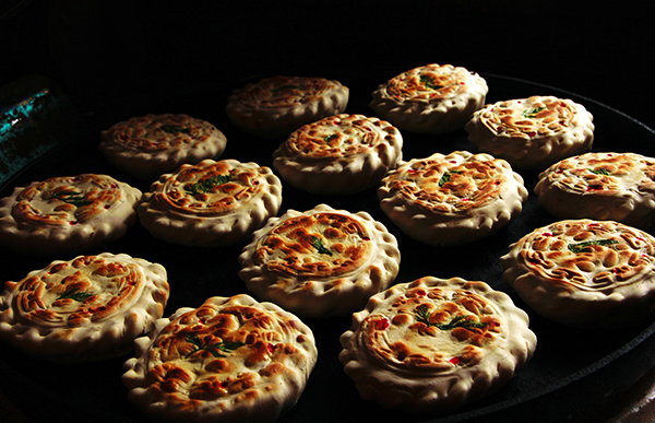 何謂“花饃饃”,顧名思義,就是用面粉做成的一種夾心并模印圖案的薄餅。一般“花饃饃”的厚度約一指厚,直徑為13厘米左右。制作“花饃饃”時,一定要用新打出的本地面粉(用新面意為喜慶豐收)并不加發(fā)酵的老面(主要防止饃饃以及饃饃上的圖案變形),只加少許蘇打以水揉面即可。心子是由藏族特有的食品酥油、糌粑、奶渣等拌上紅糖或白糖而成。先將揉好的面粉揉成巴掌大的面坨,把調好的心子包在面坨內,然后壓平,盡量使它變成圓形,并在“花饃饃”的最中心粘一小片青綠的蘿卜葉,然后用雕有各種圖案的印板印上圖案。