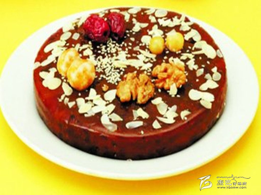 八寶年糕 原料 糯米1000克,白糖、麻仁青梅、葡萄干、瓜條、白蓮、桃脯、豬油各20克。 做法 先將糯米淘洗干凈,水浸24小時后上蒸籠蒸爛,取出用木棒搗爛攤涼,把白糖等搓勻成餡,在方盤內(nèi)刷豬油,鋪上搗爛的1厘米厚的糯米飯,每鋪一層放入適量的餡,共鋪3層,蒸熟后用刀切為小塊即成。 夾心年糕 原料 糯米1000克,青紅絲、小豆、白糖各50克。 做法 將糯米洗凈浸泡24小時后上蒸籠蒸爛,取出用木棒搗爛后展切成2塊,把小豆煮爛加糖再加青紅絲做成餡撒于其中一塊上,再將另一塊放在餡上壓實壓緊,用刀切成塊即可。