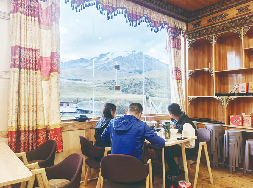 雪山下,游客一邊品美食一邊欣賞雪山。